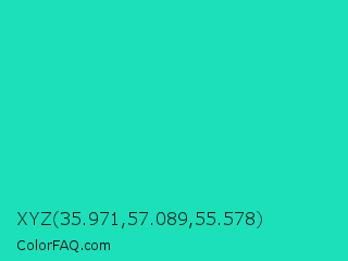 XYZ 35.971,57.089,55.578 Color is a normal cyan color and the nearest color is Turquoise PWG #30d5c8. Hex code #1be0ba and RGB value is rgb(27,224,186). In RGB color space, this color is composed of 11% red, 88% green, 73% blue, In CMYK color space, this color is composed of 88% cyan, 0% magenta, 17% yellow , 12% black , In HSL color space, this color has a hue angle of 168° , 78% saturation and 49% lightness.