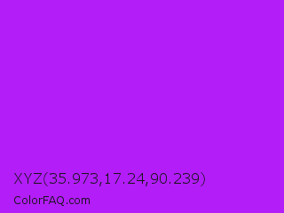 XYZ 35.973,17.24,90.239 Color is a normal purple color and the nearest color is Veronica #a020f0. Hex code #b31df8 and RGB value is rgb(179,29,248). In RGB color space, this color is composed of 70% red, 11% green, 97% blue, In CMYK color space, this color is composed of 28% cyan, 88% magenta, 0% yellow , 3% black , In HSL color space, this color has a hue angle of 281° , 94% saturation and 54% lightness.