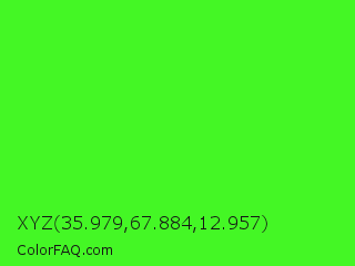 XYZ 35.979,67.884,12.957 Color is a normal green color and the nearest color is Neon Green #39ff14. Hex code #44f725 and RGB value is rgb(68,247,37). In RGB color space, this color is composed of 27% red, 97% green, 15% blue, In CMYK color space, this color is composed of 72% cyan, 0% magenta, 85% yellow , 3% black , In HSL color space, this color has a hue angle of 111° , 93% saturation and 56% lightness.