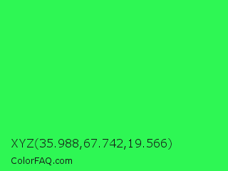 XYZ 35.988,67.742,19.566 Color is a normal green color and the nearest color is Malachite #0bda51. Hex code #2ef754 and RGB value is rgb(46,247,84). In RGB color space, this color is composed of 18% red, 97% green, 33% blue, In CMYK color space, this color is composed of 81% cyan, 0% magenta, 66% yellow , 3% black , In HSL color space, this color has a hue angle of 131° , 93% saturation and 57% lightness.