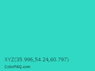 XYZ 35.996,54.24,60.797 Color is a normal cyan color and the nearest color is Turquoise PWG #30d5c8. Hex code #30d9c4 and RGB value is rgb(48,217,196). In RGB color space, this color is composed of 19% red, 85% green, 77% blue, In CMYK color space, this color is composed of 78% cyan, 0% magenta, 10% yellow , 15% black , In HSL color space, this color has a hue angle of 173° , 69% saturation and 52% lightness.