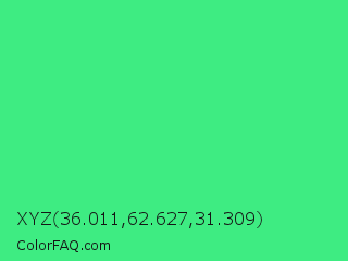 XYZ 36.011,62.627,31.309 Color is a normal green color and the nearest color is UFO Green #3cd070. Hex code #3eec82 and RGB value is rgb(62,236,130). In RGB color space, this color is composed of 24% red, 93% green, 51% blue, In CMYK color space, this color is composed of 74% cyan, 0% magenta, 45% yellow , 7% black , In HSL color space, this color has a hue angle of 143° , 82% saturation and 58% lightness.