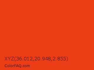 XYZ 36.012,20.948,2.855 Color is a normal red color and the nearest color is Pomegranate #f34723. Hex code #eb3c15 and RGB value is rgb(235,60,21). In RGB color space, this color is composed of 92% red, 24% green, 8% blue, In CMYK color space, this color is composed of 0% cyan, 74% magenta, 91% yellow , 8% black , In HSL color space, this color has a hue angle of 11° , 84% saturation and 50% lightness.