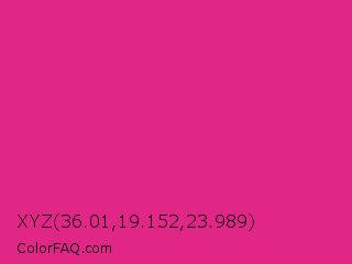 XYZ 36.01,19.152,23.989 Color is a normal rose color and the nearest color is Barbie Pink #e0218a. Hex code #e12785 and RGB value is rgb(225,39,133). In RGB color space, this color is composed of 88% red, 15% green, 52% blue, In CMYK color space, this color is composed of 0% cyan, 83% magenta, 41% yellow , 12% black , In HSL color space, this color has a hue angle of 330° , 76% saturation and 52% lightness.