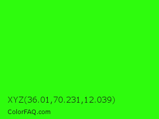 XYZ 36.01,70.231,12.039 Color is a normal green color and the nearest color is Neon Green #39ff14. Hex code #2efc0d and RGB value is rgb(46,252,13). In RGB color space, this color is composed of 18% red, 99% green, 5% blue, In CMYK color space, this color is composed of 82% cyan, 0% magenta, 95% yellow , 1% black , In HSL color space, this color has a hue angle of 112° , 98% saturation and 52% lightness.