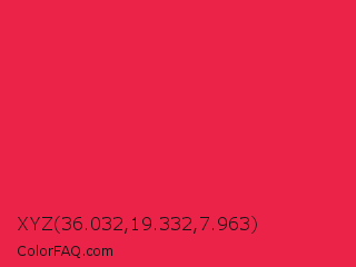 XYZ 36.032,19.332,7.963 Color is a normal red color and the nearest color is Red Crayola #ee204d. Hex code #eb2348 and RGB value is rgb(235,35,72). In RGB color space, this color is composed of 92% red, 14% green, 28% blue, In CMYK color space, this color is composed of 0% cyan, 85% magenta, 69% yellow , 8% black , In HSL color space, this color has a hue angle of 349° , 83% saturation and 53% lightness.