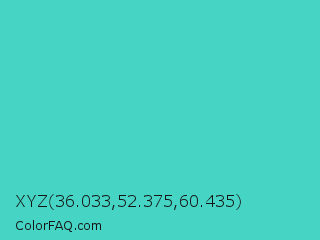 XYZ 36.033,52.375,60.435 Color is a normal cyan color and the nearest color is Medium Turquoise #48d1cc. Hex code #46d4c4 and RGB value is rgb(70,212,196). In RGB color space, this color is composed of 27% red, 83% green, 77% blue, In CMYK color space, this color is composed of 67% cyan, 0% magenta, 8% yellow , 17% black , In HSL color space, this color has a hue angle of 173° , 62% saturation and 55% lightness.