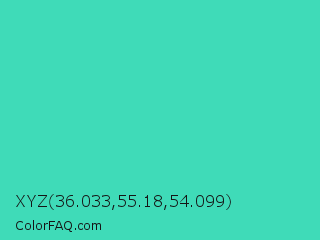 XYZ 36.033,55.18,54.099 Color is a normal cyan color and the nearest color is Eucalyptus #44d7a8. Hex code #3fdbb8 and RGB value is rgb(63,219,184). In RGB color space, this color is composed of 25% red, 86% green, 72% blue, In CMYK color space, this color is composed of 71% cyan, 0% magenta, 16% yellow , 14% black , In HSL color space, this color has a hue angle of 167° , 68% saturation and 55% lightness.