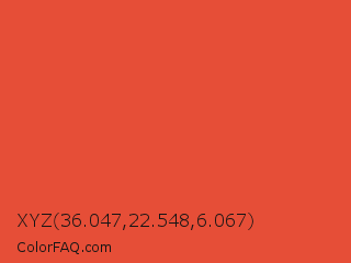 XYZ 36.047,22.548,6.067 Color is a normal red color and the nearest color is Carmine Pink #eb4c42. Hex code #e64e37 and RGB value is rgb(230,78,55). In RGB color space, this color is composed of 90% red, 31% green, 22% blue, In CMYK color space, this color is composed of 0% cyan, 66% magenta, 76% yellow , 10% black , In HSL color space, this color has a hue angle of 8° , 78% saturation and 56% lightness.