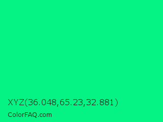 XYZ 36.048,65.23,32.881 Color is a normal green color and the nearest color is Spring Green #00ff7f. Hex code #05f285 and RGB value is rgb(5,242,133). In RGB color space, this color is composed of 2% red, 95% green, 52% blue, In CMYK color space, this color is composed of 98% cyan, 0% magenta, 45% yellow , 5% black , In HSL color space, this color has a hue angle of 152° , 96% saturation and 48% lightness.