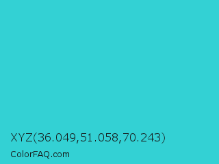 XYZ 36.049,51.058,70.243 Color is a normal cyan color and the nearest color is Turquoise PWG #30d5c8. Hex code #33d1d4 and RGB value is rgb(51,209,212). In RGB color space, this color is composed of 20% red, 82% green, 83% blue, In CMYK color space, this color is composed of 76% cyan, 1% magenta, 0% yellow , 17% black , In HSL color space, this color has a hue angle of 181° , 65% saturation and 52% lightness.