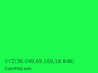 XYZ 36.049,69.169,18.848 Color is a normal green color and the nearest color is Malachite #0bda51. Hex code #1bfa4f and RGB value is rgb(27,250,79). In RGB color space, this color is composed of 11% red, 98% green, 31% blue, In CMYK color space, this color is composed of 89% cyan, 0% magenta, 68% yellow , 2% black , In HSL color space, this color has a hue angle of 134° , 96% saturation and 54% lightness.