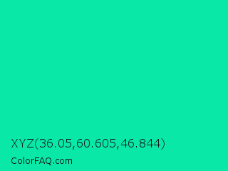 XYZ 36.05,60.605,46.844 Color is a normal green color and the nearest color is Medium Spring Green #00fa9a. Hex code #0ae8a8 and RGB value is rgb(10,232,168). In RGB color space, this color is composed of 4% red, 91% green, 66% blue, In CMYK color space, this color is composed of 96% cyan, 0% magenta, 28% yellow , 9% black , In HSL color space, this color has a hue angle of 163° , 92% saturation and 47% lightness.