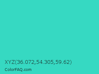 XYZ 36.072,54.305,59.62 Color is a normal cyan color and the nearest color is Turquoise PWG #30d5c8. Hex code #36d9c2 and RGB value is rgb(54,217,194). In RGB color space, this color is composed of 21% red, 85% green, 76% blue, In CMYK color space, this color is composed of 75% cyan, 0% magenta, 11% yellow , 15% black , In HSL color space, this color has a hue angle of 172° , 68% saturation and 53% lightness.