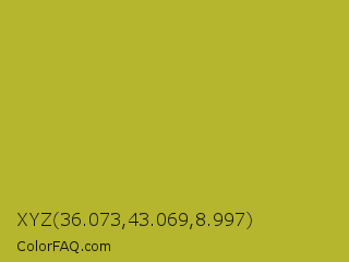 XYZ 36.073,43.069,8.997 Color is a normal yellow color and the nearest color is Acid Green #b0bf1a. Hex code #b5b52e and RGB value is rgb(181,181,46). In RGB color space, this color is composed of 71% red, 71% green, 18% blue, In CMYK color space, this color is composed of 0% cyan, 0% magenta, 75% yellow , 29% black , In HSL color space, this color has a hue angle of 60° , 59% saturation and 45% lightness.
