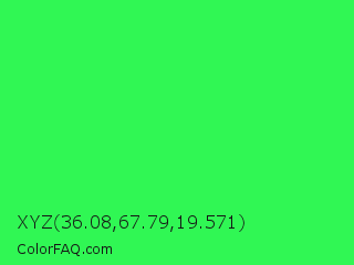 XYZ 36.08,67.79,19.571 Color is a normal green color and the nearest color is Malachite #0bda51. Hex code #30f754 and RGB value is rgb(48,247,84). In RGB color space, this color is composed of 19% red, 97% green, 33% blue, In CMYK color space, this color is composed of 81% cyan, 0% magenta, 66% yellow , 3% black , In HSL color space, this color has a hue angle of 131° , 93% saturation and 58% lightness.