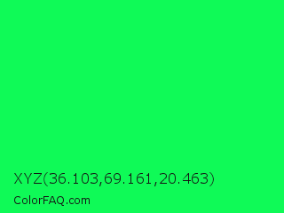 XYZ 36.103,69.161,20.463 Color is a normal green color and the nearest color is Malachite #0bda51. Hex code #0ffa57 and RGB value is rgb(15,250,87). In RGB color space, this color is composed of 6% red, 98% green, 34% blue, In CMYK color space, this color is composed of 94% cyan, 0% magenta, 65% yellow , 2% black , In HSL color space, this color has a hue angle of 138° , 96% saturation and 52% lightness.