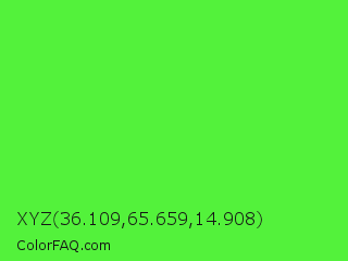 XYZ 36.109,65.659,14.908 Color is a normal green color and the nearest color is Neon Green #39ff14. Hex code #53f23b and RGB value is rgb(83,242,59). In RGB color space, this color is composed of 33% red, 95% green, 23% blue, In CMYK color space, this color is composed of 66% cyan, 0% magenta, 76% yellow , 5% black , In HSL color space, this color has a hue angle of 112° , 88% saturation and 59% lightness.