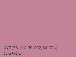 XYZ 36.114,30.002,34.024 Color is a light rose color and the nearest color is Puce #cc8899. Hex code #c28399 and RGB value is rgb(194,131,153). In RGB color space, this color is composed of 76% red, 51% green, 60% blue, In CMYK color space, this color is composed of 0% cyan, 32% magenta, 21% yellow , 24% black , In HSL color space, this color has a hue angle of 339° , 34% saturation and 64% lightness.