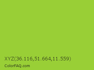 XYZ 36.116,51.664,11.559 Color is a normal green color and the nearest color is Yellow Green #9acd32. Hex code #99cf36 and RGB value is rgb(153,207,54). In RGB color space, this color is composed of 60% red, 81% green, 21% blue, In CMYK color space, this color is composed of 26% cyan, 0% magenta, 74% yellow , 19% black , In HSL color space, this color has a hue angle of 81° , 61% saturation and 51% lightness.
