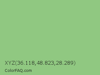 XYZ 36.118,48.823,28.289 Color is a light green color and the nearest color is Pistachio #93c572. Hex code #90c881 and RGB value is rgb(144,200,129). In RGB color space, this color is composed of 56% red, 78% green, 51% blue, In CMYK color space, this color is composed of 28% cyan, 0% magenta, 36% yellow , 22% black , In HSL color space, this color has a hue angle of 107° , 39% saturation and 65% lightness.