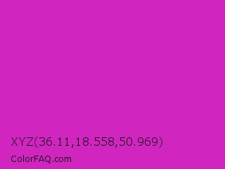 XYZ 36.11,18.558,50.969 Color is a normal magenta color and the nearest color is Steel Pink #cc33cc. Hex code #d026bf and RGB value is rgb(208,38,191). In RGB color space, this color is composed of 82% red, 15% green, 75% blue, In CMYK color space, this color is composed of 0% cyan, 82% magenta, 8% yellow , 18% black , In HSL color space, this color has a hue angle of 306° , 69% saturation and 48% lightness.