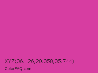 XYZ 36.126,20.358,35.744 Color is a normal magenta color and the nearest color is Pink Pantone #d74894. Hex code #d73da1 and RGB value is rgb(215,61,161). In RGB color space, this color is composed of 84% red, 24% green, 63% blue, In CMYK color space, this color is composed of 0% cyan, 72% magenta, 25% yellow , 16% black , In HSL color space, this color has a hue angle of 321° , 66% saturation and 54% lightness.