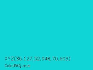 XYZ 36.127,52.948,70.603 Color is a normal cyan color and the nearest color is Dark Turquoise #00ced1. Hex code #0fd6d4 and RGB value is rgb(15,214,212). In RGB color space, this color is composed of 6% red, 84% green, 83% blue, In CMYK color space, this color is composed of 93% cyan, 0% magenta, 1% yellow , 16% black , In HSL color space, this color has a hue angle of 179° , 87% saturation and 45% lightness.