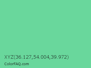 XYZ 36.127,54.004,39.972 Color is a light green color and the nearest color is Medium Aquamarine #66ddaa. Hex code #69d79c and RGB value is rgb(105,215,156). In RGB color space, this color is composed of 41% red, 84% green, 61% blue, In CMYK color space, this color is composed of 51% cyan, 0% magenta, 27% yellow , 16% black , In HSL color space, this color has a hue angle of 148° , 58% saturation and 63% lightness.