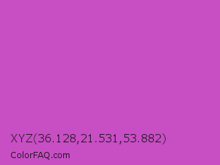 XYZ 36.128,21.531,53.882 Color is a normal magenta color and the nearest color is Fuchsia Pink #c154c1. Hex code #c74ec3 and RGB value is rgb(199,78,195). In RGB color space, this color is composed of 78% red, 31% green, 76% blue, In CMYK color space, this color is composed of 0% cyan, 61% magenta, 2% yellow , 22% black , In HSL color space, this color has a hue angle of 302° , 52% saturation and 54% lightness.