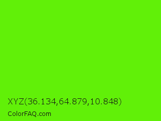 XYZ 36.134,64.879,10.848 Color is a normal green color and the nearest color is Bright Green #66ff00. Hex code #61f008 and RGB value is rgb(97,240,8). In RGB color space, this color is composed of 38% red, 94% green, 3% blue, In CMYK color space, this color is composed of 60% cyan, 0% magenta, 97% yellow , 6% black , In HSL color space, this color has a hue angle of 97° , 94% saturation and 49% lightness.