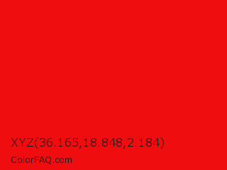 XYZ 36.165,18.848,2.184 Color is a normal red color and the nearest color is Vivid Red #f70d1a. Hex code #f00d0f and RGB value is rgb(240,13,15). In RGB color space, this color is composed of 94% red, 5% green, 6% blue, In CMYK color space, this color is composed of 0% cyan, 95% magenta, 94% yellow , 6% black , In HSL color space, this color has a hue angle of 359° , 90% saturation and 50% lightness.