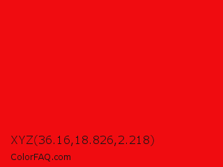 XYZ 36.16,18.826,2.218 Color is a normal red color and the nearest color is Vivid Red #f70d1a. Hex code #f00c10 and RGB value is rgb(240,12,16). In RGB color space, this color is composed of 94% red, 5% green, 6% blue, In CMYK color space, this color is composed of 0% cyan, 95% magenta, 93% yellow , 6% black , In HSL color space, this color has a hue angle of 359° , 90% saturation and 49% lightness.