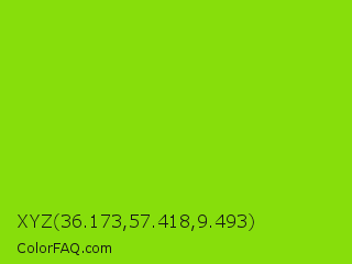 XYZ 36.173,57.418,9.493 Color is a normal green color and the nearest color is Alien Armpit #84de02. Hex code #87de0b and RGB value is rgb(135,222,11). In RGB color space, this color is composed of 53% red, 87% green, 4% blue, In CMYK color space, this color is composed of 39% cyan, 0% magenta, 95% yellow , 13% black , In HSL color space, this color has a hue angle of 85° , 91% saturation and 46% lightness.