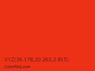 XYZ 36.178,20.263,2.815 Color is a normal red color and the nearest color is Red RYB #fe2712. Hex code #ed3117 and RGB value is rgb(237,49,23). In RGB color space, this color is composed of 93% red, 19% green, 9% blue, In CMYK color space, this color is composed of 0% cyan, 79% magenta, 90% yellow , 7% black , In HSL color space, this color has a hue angle of 7° , 86% saturation and 51% lightness.