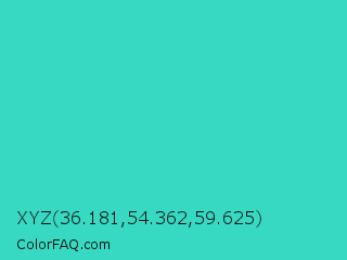 XYZ 36.181,54.362,59.625 Color is a normal cyan color and the nearest color is Turquoise PWG #30d5c8. Hex code #38d9c2 and RGB value is rgb(56,217,194). In RGB color space, this color is composed of 22% red, 85% green, 76% blue, In CMYK color space, this color is composed of 74% cyan, 0% magenta, 11% yellow , 15% black , In HSL color space, this color has a hue angle of 171° , 68% saturation and 54% lightness.
