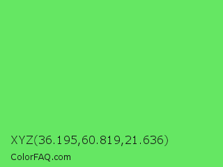XYZ 36.195,60.819,21.636 Color is a light green color and the nearest color is Screamin Green #66ff66. Hex code #65e763 and RGB value is rgb(101,231,99). In RGB color space, this color is composed of 40% red, 91% green, 39% blue, In CMYK color space, this color is composed of 56% cyan, 0% magenta, 57% yellow , 9% black , In HSL color space, this color has a hue angle of 119° , 73% saturation and 65% lightness.