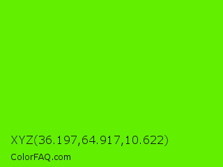 XYZ 36.197,64.917,10.622 Color is a normal green color and the nearest color is Bright Green #66ff00. Hex code #62f000 and RGB value is rgb(98,240,0). In RGB color space, this color is composed of 38% red, 94% green, 0% blue, In CMYK color space, this color is composed of 59% cyan, 0% magenta, 100% yellow , 6% black , In HSL color space, this color has a hue angle of 96° , 100% saturation and 47% lightness.