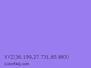 XYZ 36.199,27.731,85.883 Color is a light indigo color and the nearest color is Medium Purple #9370db. Hex code #997df0 and RGB value is rgb(153,125,240). In RGB color space, this color is composed of 60% red, 49% green, 94% blue, In CMYK color space, this color is composed of 36% cyan, 48% magenta, 0% yellow , 6% black , In HSL color space, this color has a hue angle of 255° , 79% saturation and 72% lightness.