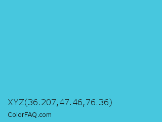 XYZ 36.207,47.46,76.36 Color is a normal cyan color and the nearest color is Sea Serpent #4bc7cf. Hex code #47c7de and RGB value is rgb(71,199,222). In RGB color space, this color is composed of 28% red, 78% green, 87% blue, In CMYK color space, this color is composed of 68% cyan, 10% magenta, 0% yellow , 13% black , In HSL color space, this color has a hue angle of 189° , 70% saturation and 57% lightness.