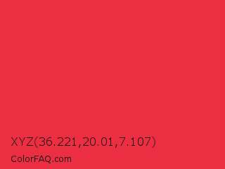 XYZ 36.221,20.01,7.107 Color is a normal red color and the nearest color is Imperial Red #ed2939. Hex code #eb2e42 and RGB value is rgb(235,46,66). In RGB color space, this color is composed of 92% red, 18% green, 26% blue, In CMYK color space, this color is composed of 0% cyan, 80% magenta, 72% yellow , 8% black , In HSL color space, this color has a hue angle of 354° , 83% saturation and 55% lightness.