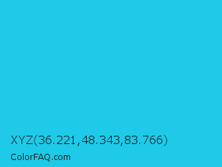 XYZ 36.221,48.343,83.766 Color is a normal cyan color and the nearest color is Spiro Disco Ball #0fc0fc. Hex code #1ecae8 and RGB value is rgb(30,202,232). In RGB color space, this color is composed of 12% red, 79% green, 91% blue, In CMYK color space, this color is composed of 87% cyan, 13% magenta, 0% yellow , 9% black , In HSL color space, this color has a hue angle of 189° , 81% saturation and 51% lightness.