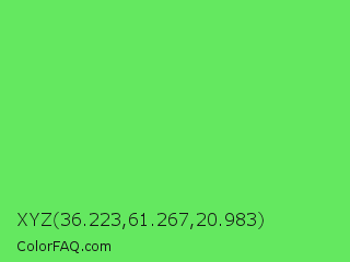 XYZ 36.223,61.267,20.983 Color is a light green color and the nearest color is Screamin Green #66ff66. Hex code #64e860 and RGB value is rgb(100,232,96). In RGB color space, this color is composed of 39% red, 91% green, 38% blue, In CMYK color space, this color is composed of 57% cyan, 0% magenta, 59% yellow , 9% black , In HSL color space, this color has a hue angle of 118° , 75% saturation and 64% lightness.