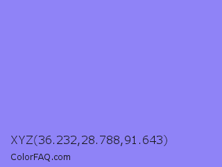 XYZ 36.232,28.788,91.643 Color is a light indigo color and the nearest color is Portage #8b9fee. Hex code #8f83f7 and RGB value is rgb(143,131,247). In RGB color space, this color is composed of 56% red, 51% green, 97% blue, In CMYK color space, this color is composed of 42% cyan, 47% magenta, 0% yellow , 3% black , In HSL color space, this color has a hue angle of 246° , 88% saturation and 74% lightness.