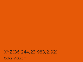 XYZ 36.244,23.983,2.92 Color is a normal orange color and the nearest color is Persimmon #ec5800. Hex code #e65907 and RGB value is rgb(230,89,7). In RGB color space, this color is composed of 90% red, 35% green, 3% blue, In CMYK color space, this color is composed of 0% cyan, 61% magenta, 97% yellow , 10% black , In HSL color space, this color has a hue angle of 22° , 94% saturation and 46% lightness.