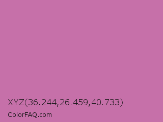 XYZ 36.244,26.459,40.733 Color is a light magenta color and the nearest color is Super Pink #cf6ba9. Hex code #c670a9 and RGB value is rgb(198,112,169). In RGB color space, this color is composed of 78% red, 44% green, 66% blue, In CMYK color space, this color is composed of 0% cyan, 43% magenta, 15% yellow , 22% black , In HSL color space, this color has a hue angle of 320° , 43% saturation and 61% lightness.
