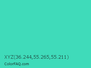 XYZ 36.244,55.265,55.211 Color is a normal cyan color and the nearest color is Eucalyptus #44d7a8. Hex code #3fdbba and RGB value is rgb(63,219,186). In RGB color space, this color is composed of 25% red, 86% green, 73% blue, In CMYK color space, this color is composed of 71% cyan, 0% magenta, 15% yellow , 14% black , In HSL color space, this color has a hue angle of 167° , 68% saturation and 55% lightness.