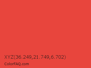 XYZ 36.249,21.749,6.702 Color is a normal red color and the nearest color is Carmine Pink #eb4c42. Hex code #e8453d and RGB value is rgb(232,69,61). In RGB color space, this color is composed of 91% red, 27% green, 24% blue, In CMYK color space, this color is composed of 0% cyan, 70% magenta, 74% yellow , 9% black , In HSL color space, this color has a hue angle of 3° , 79% saturation and 57% lightness.