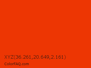 XYZ 36.261,20.649,2.161 Color is a normal red color and the nearest color is Coquelicot #ff3800. Hex code #ed3603 and RGB value is rgb(237,54,3). In RGB color space, this color is composed of 93% red, 21% green, 1% blue, In CMYK color space, this color is composed of 0% cyan, 77% magenta, 99% yellow , 7% black , In HSL color space, this color has a hue angle of 13° , 98% saturation and 47% lightness.