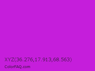 XYZ 36.276,17.913,68.563 Color is a normal magenta color and the nearest color is Vivid Mulberry #b80ce3. Hex code #c51edb and RGB value is rgb(197,30,219). In RGB color space, this color is composed of 77% red, 12% green, 86% blue, In CMYK color space, this color is composed of 10% cyan, 86% magenta, 0% yellow , 14% black , In HSL color space, this color has a hue angle of 293° , 76% saturation and 49% lightness.